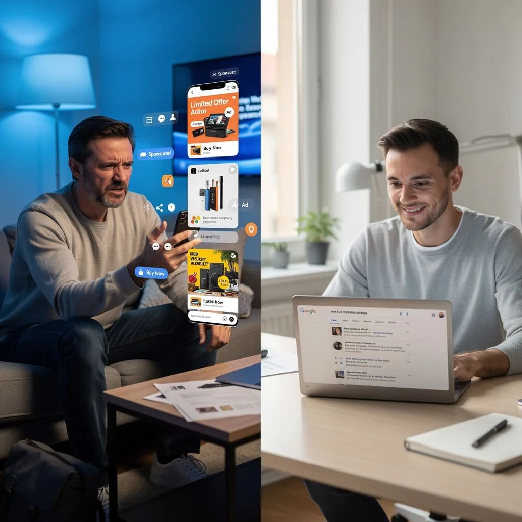 Push-Marketing (z. B. Social Ads ohne klare Struktur) unterbricht und nervt. Intelligente Sichtbarkeit dagegen führt zum Ziel.